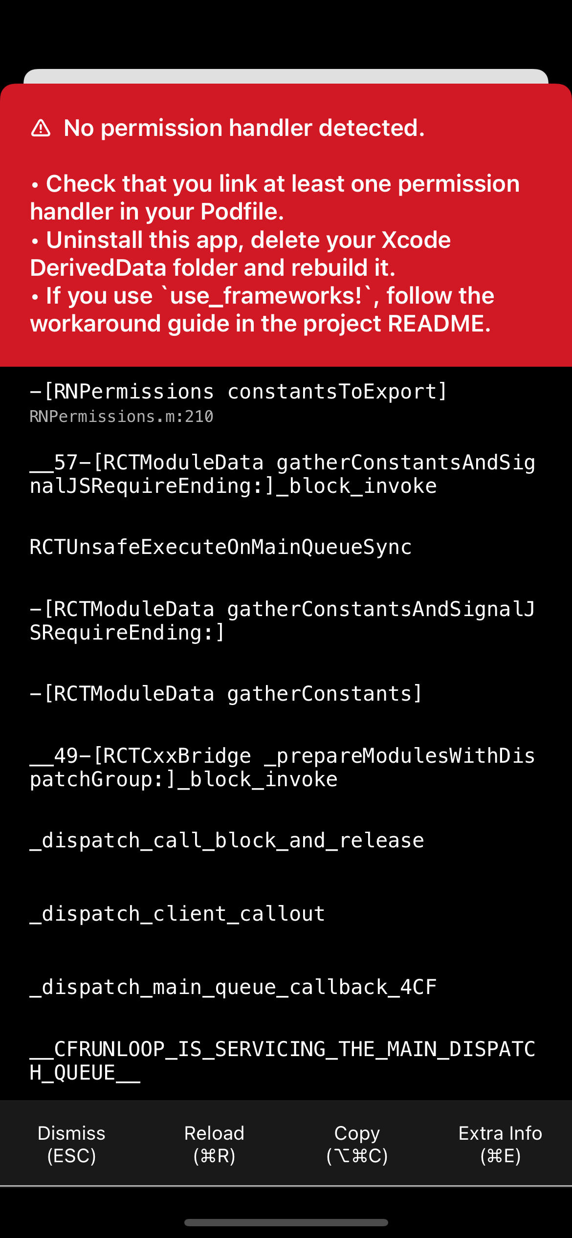Bug After I have tried to install react-native-permissions package, I have faced with this error on IOS Simulator. I ignored it but it also prevented to test app on testflight. Error ⚠ No permissio...