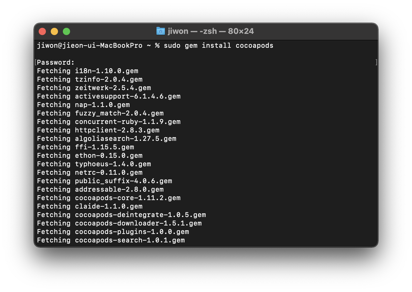터미널에 아래 명령어를 입력하여 Cocoapods를 설치합니다.