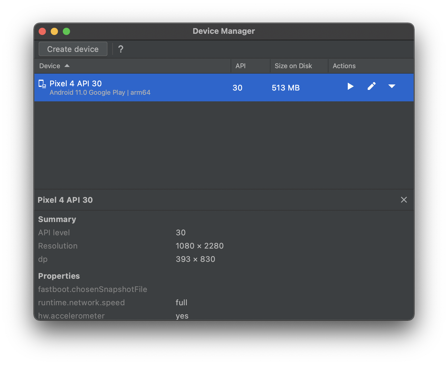 선택한 AVD가 뜨며 Finish를 누르면 device가 생성된 걸 확인할 수 있습니다.