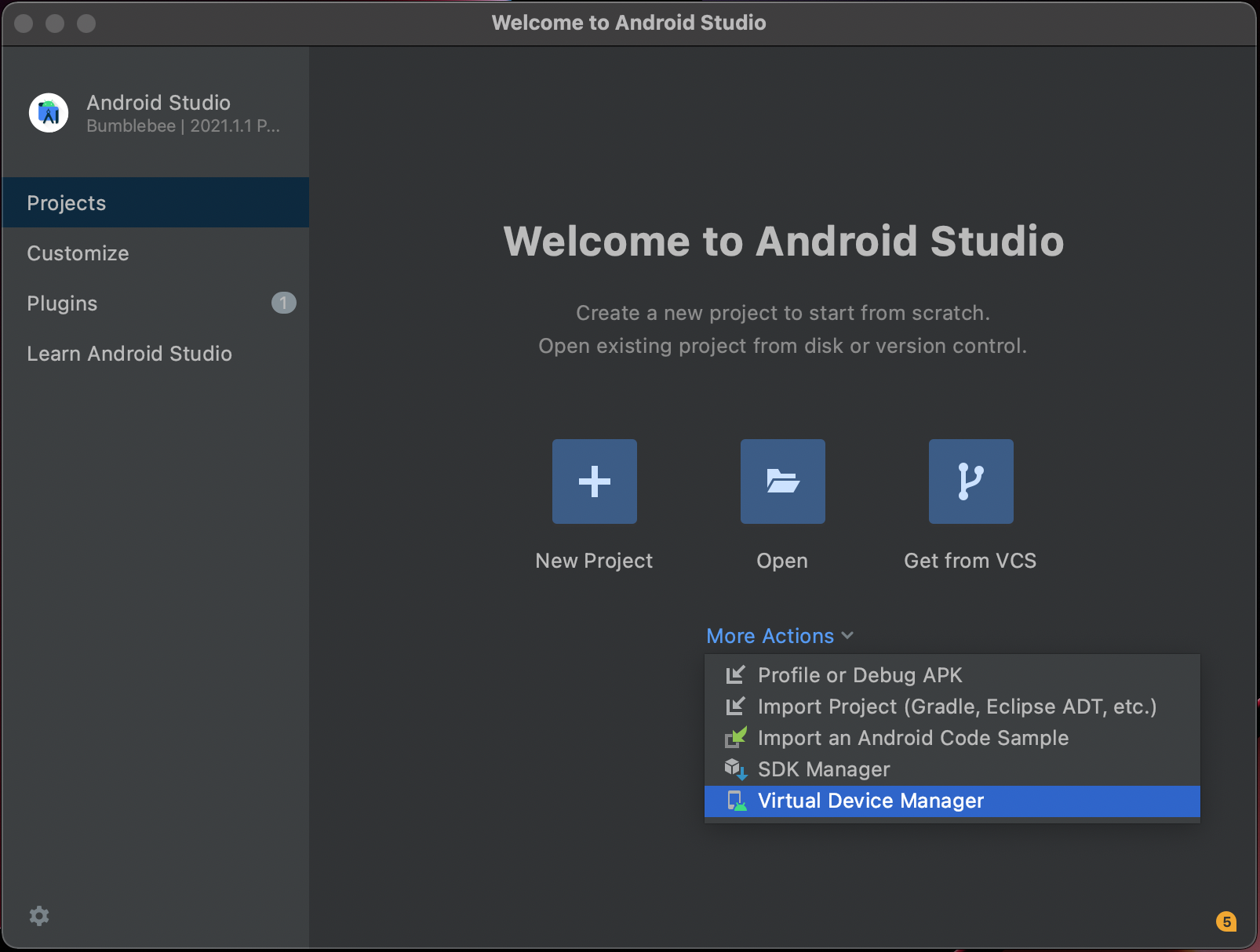 Android Studio를 실행하여 하단의 More Actions > Virtual Device Manager를 선택하여, Create device를 클릭합니다.