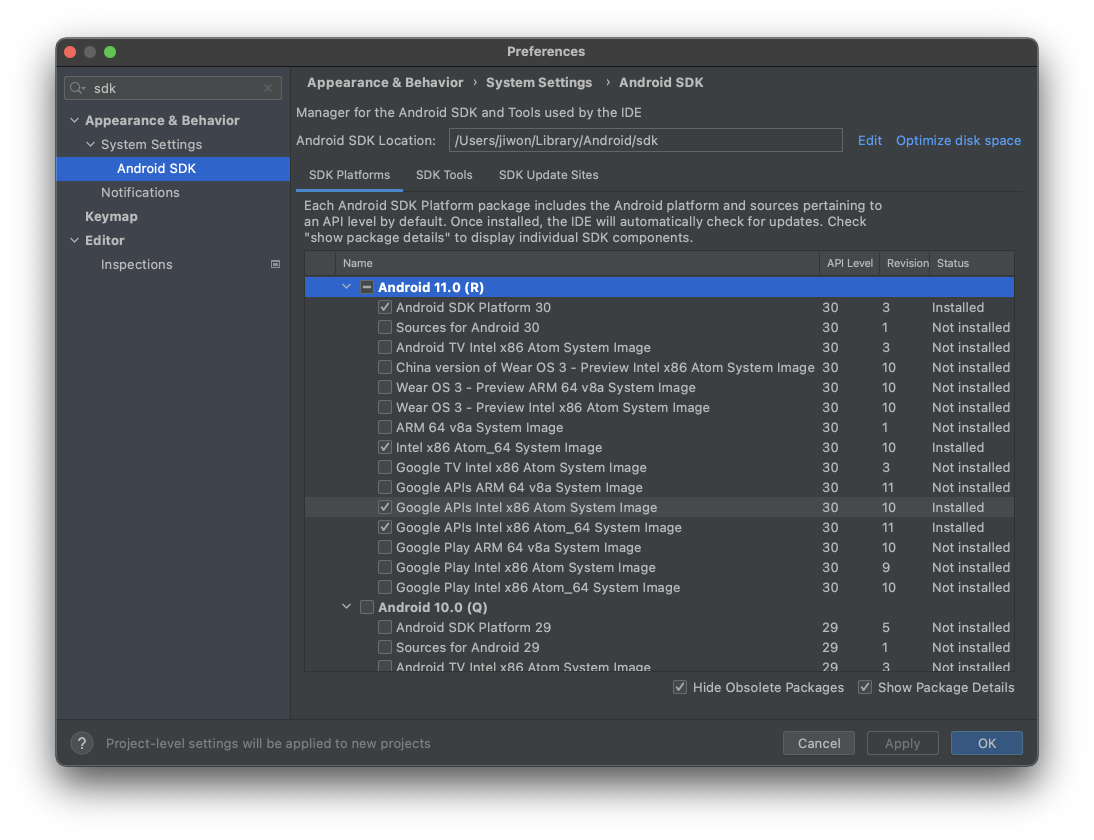 Android Studio를 실행하여 상단 메뉴의 Preference > Android SDK 메뉴로 이동 후, 우측 하단의 Show Package Details를 선택합니다. 자신에게 필요한 API Level에 맞는 SDK Platform을 선택하여, 아래의 내용을 찾아 OK 버튼을 누릅니다.