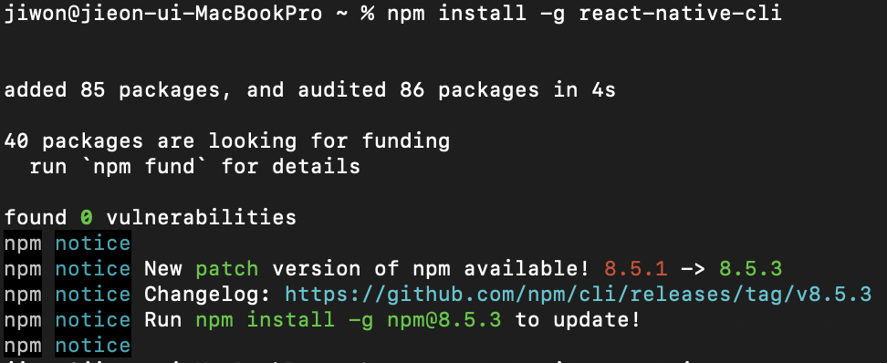 터미널에 아래 명령어를 입력하여 React Native CLI를 설치합니다.