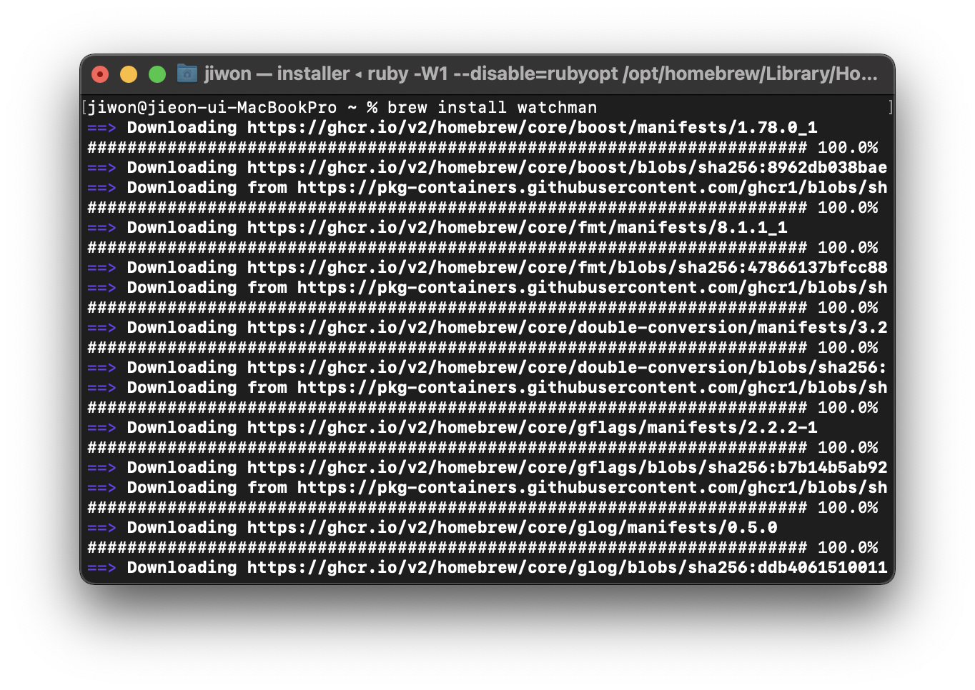 터미널에 아래 명령어를 입력하여 Watchman을 설치합니다.