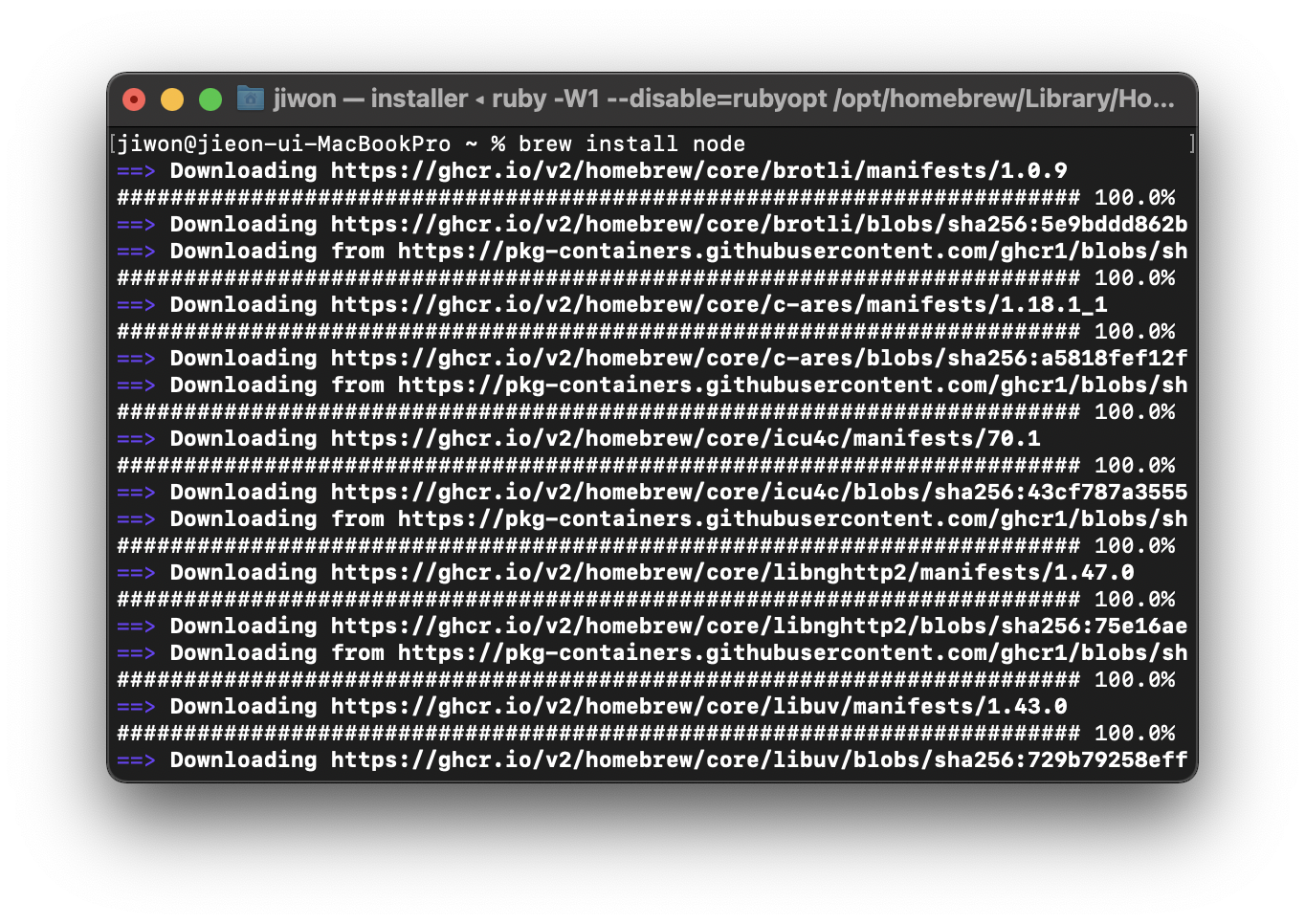 터미널에 아래 명령어를 입력하여 Nodejs를 설치합니다.