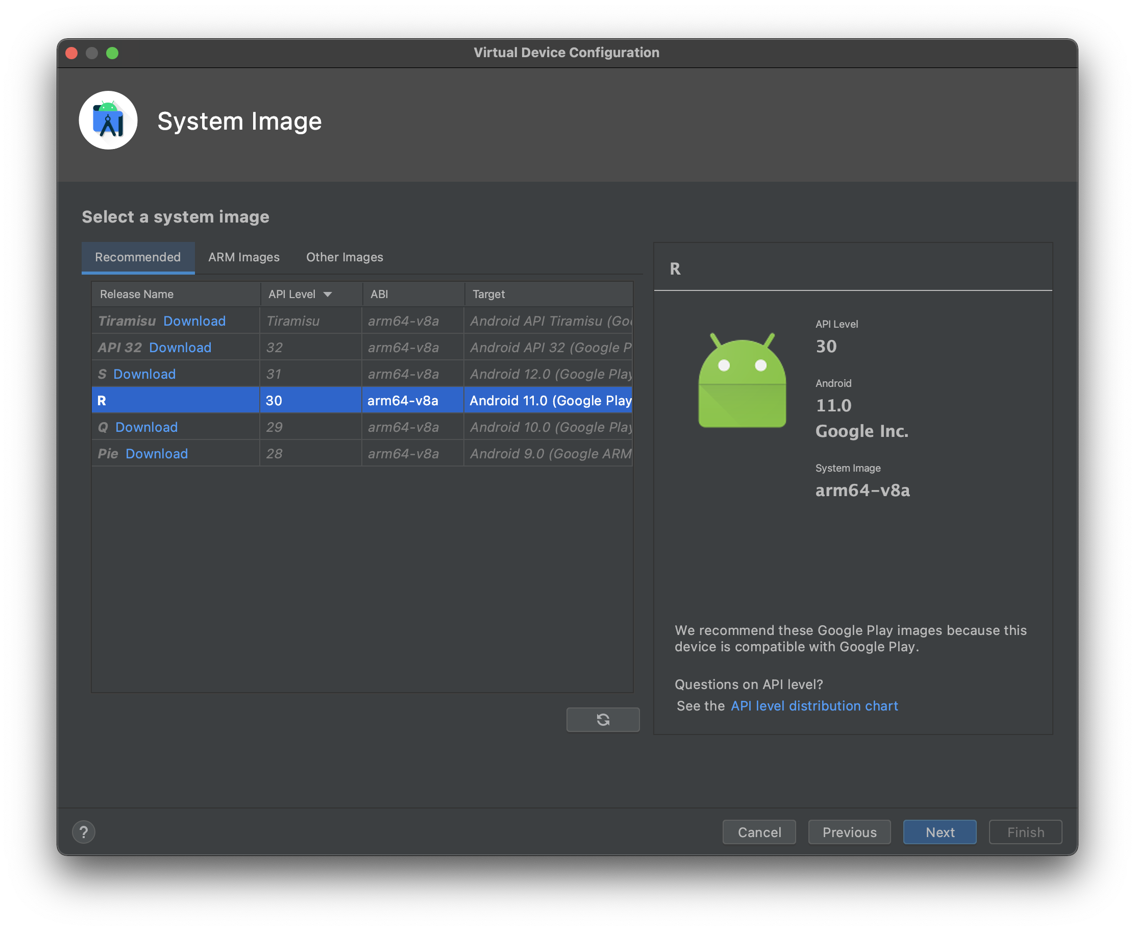 * 저는 API Level 30의 Android 11.0(R)를 선택하였습니다.