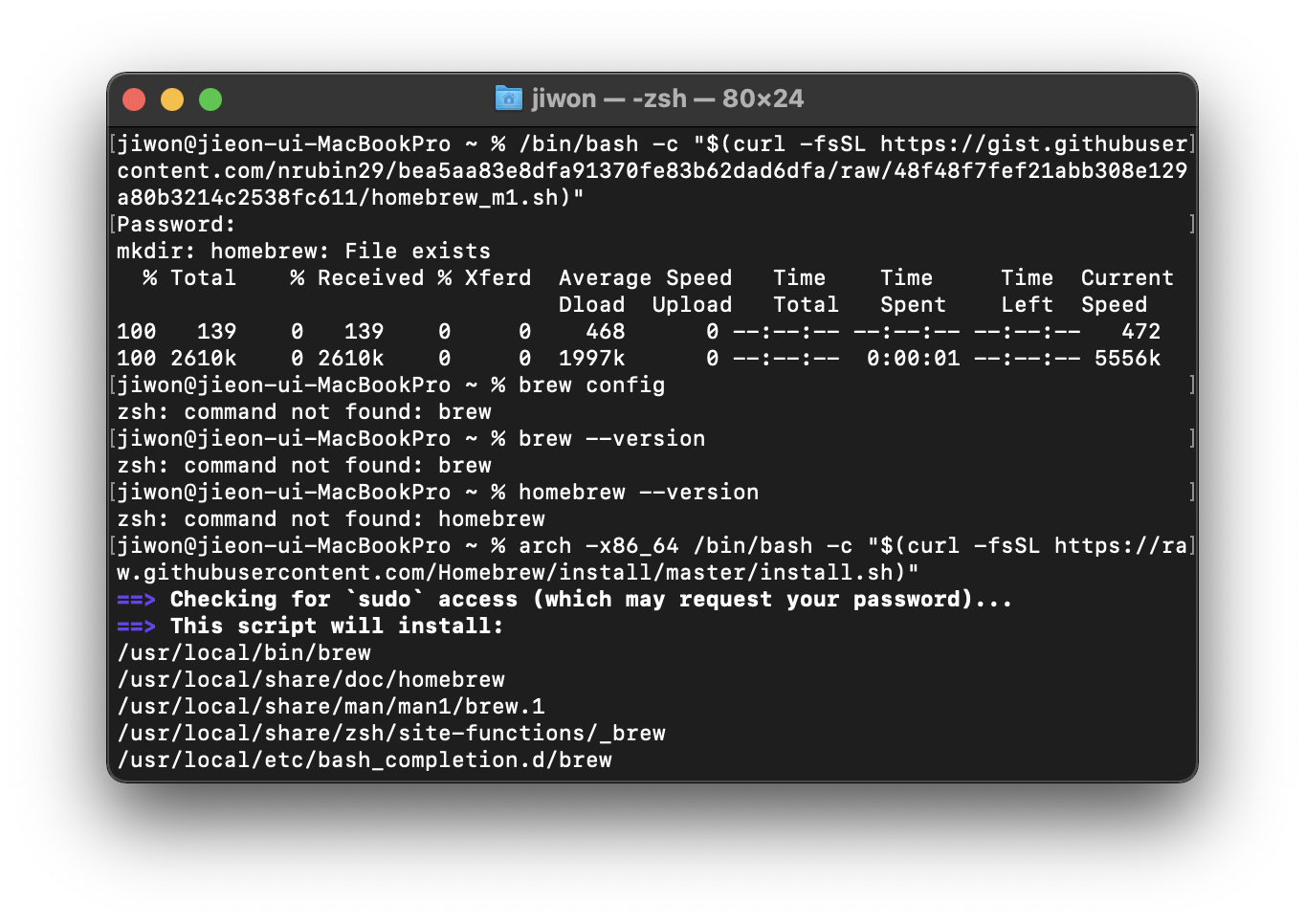 M1 칩의 경우 터미널에 아래 명령어를 입력하여 Homebrew를 설치합니다.