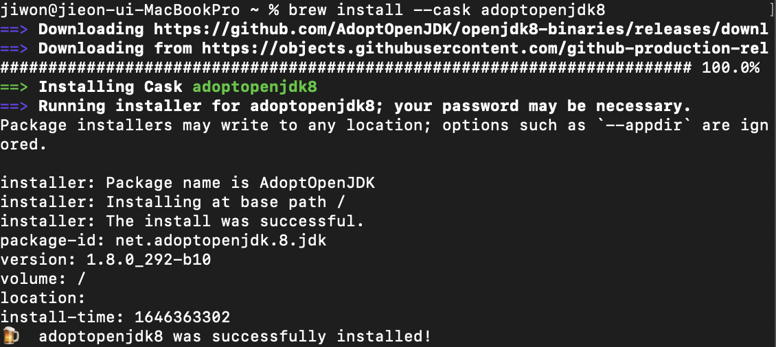 터미널에 아래 명령어를 입력하여 JDK를 설치합니다.